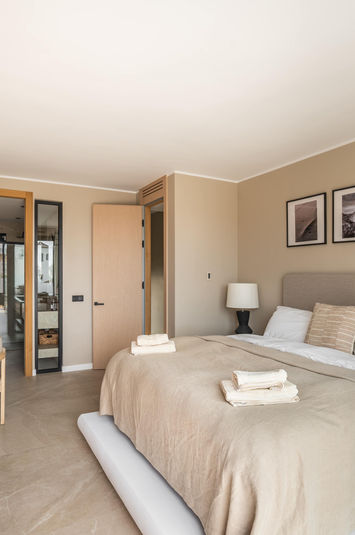 On the ground floor, you’ll find a guest toilet with a shower and two bedrooms, one of which is en-suite with a spacious walk-in wardrobe. Upstairs, there are three more bedrooms, including the master suite with a private terrace, a large bathroom, and an outdoor bathtub—a perfect personal retreat. The other two bedrooms share a generous bathroom with double sinks and a shower. Each bedroom features bespoke wooden storage with interior lighting.